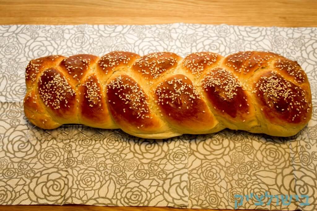 - מורחים ביצה טרופה על החלה ומפזרים שומשום מעל. מכניסים לתנור שחומם מראש ל 180 מעלות למשך 35 דקות.